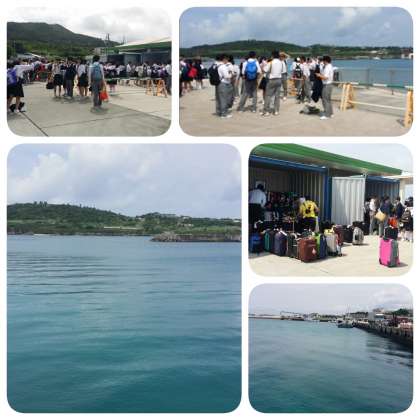 バスから降りて、コンテナに荷物を乗せ、フェリーに乗るまでの時間を過ごしています。晴れて暑いです! 晴れというだけでワクワクしますね♪ 海は透き通っていて、シマダイが泳いでいるのが見えています。