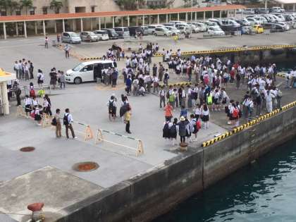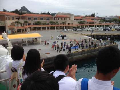 離村式、クラス写真、学年写真を撮影した後、乗船前にお世話になった民家の皆様と最後のお別れをしています。