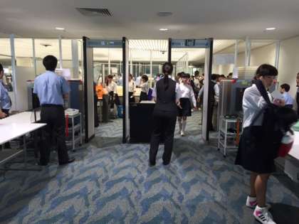 関空組,空港に着き,セキュリティチェックを受けています。