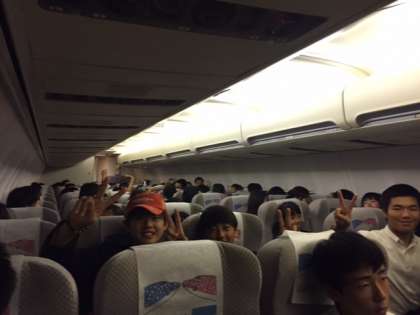 駐機場に向かう機内の中です。笑い声が絶えません。みんな元気です。