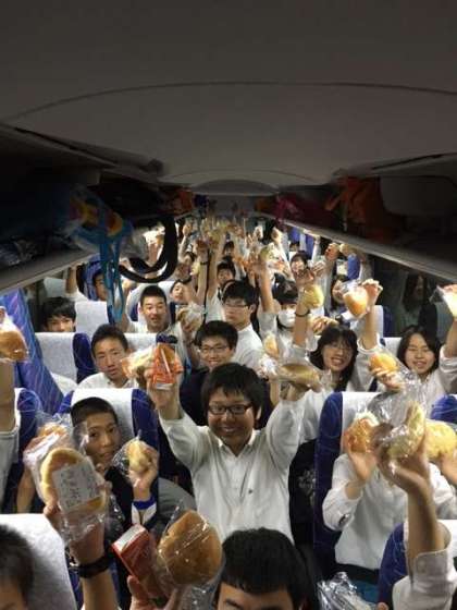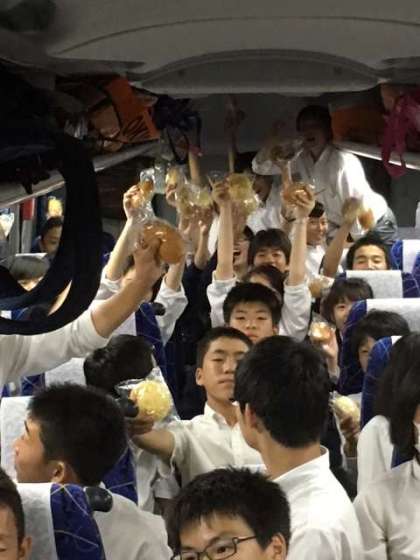 バスに乗り込み、補食のメロンパンとジャムパンとオレンジジュースを配布しました。