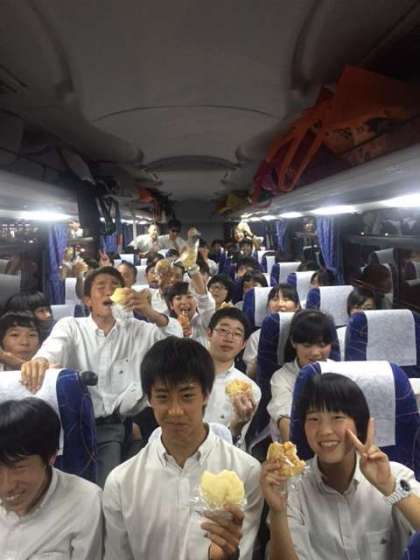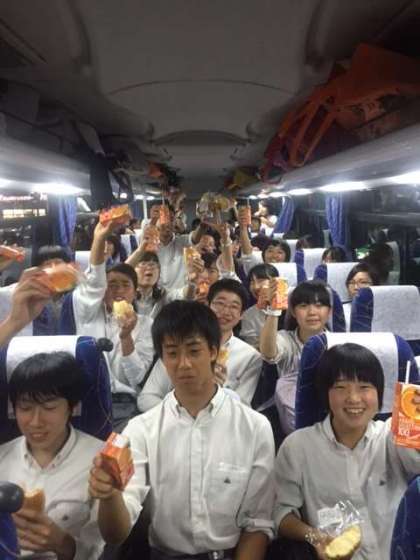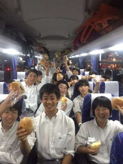 嵯峨中に向けて伊丹組、4.8組が乗るバスが出発しました。バス内で捕食のジャムパン、メロンパン、オレンジジュースを食べています。