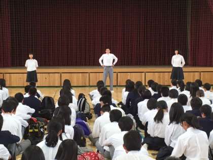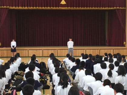 5月19日〜21日の2泊3日の沖縄への修学旅行で平和学習で学んだことと伊江島での民泊体験で楽しかったことについて修学旅行委員から話してもらいました。