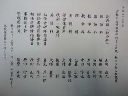 なお,離任式は,3月31日(金)午前9時より,本校体育館にて行います。