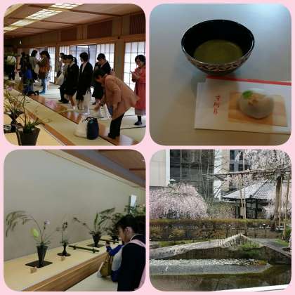 池坊会館には,全国で活動する華道家が1本の葉先にまで気持ちを込めて生けた作品を見学しました。どの作品を見ても美しく,大変学びになりました。道場にも入らせていただき,多数のいけばなや,江戸末期の襖を見たりしました。そしてお茶席で,六角堂の桜,鯉,白鳥を眺めながらおいしいお菓子とお茶をいただき,ほっこりしました。