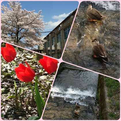 嵯峨中学校の敷地には,有栖川が流れています。保護者の方の中には,嵯峨中学校卒業生の方もおられると思いますが,有栖川の土手に草いっぱい生えていた頃をご存じでしょうか。今は有栖川の土手も,大変きいれいに整備されていて,間近で川の流れを眺めることができるくらい,下までおりていくことができます。今日は鴨のペアが有栖川にやってきていました。チューリップも咲いています。