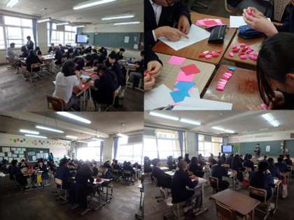 それぞれの色にそれぞれの思いを込め,千羽になるように折っていきます。