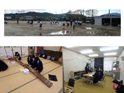 下の写真は,西グラウンドの様子をパノラマで撮影したものと,箏を弾いている伝統文化部,報道部の写真です。