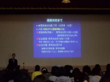 続いて,進路指導主事より,進路についての話です。まず始めに,3年生が,学習に前向きに取り組んでいる様子が紹介されました。次いで,・平成28年度卒業生の進路状況,・進路決定に向けて,・京都の入試制度について,・奨学金制度その他 の話がありました。