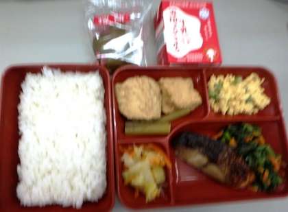 旬のふきを使った「厚揚げとふきの煮付け」や,エンドウ豆を使った「エンドウ豆の卵とじ」そして,デザートの「桜餅」で春を感じられる献立でした。主菜は「鯵の照り焼き」ですが,その横に添えてある「菜の花の炒め物」は新メニュー。春が旬の菜の花を,ほうれんそう,にんじんと一緒に炒め,からしの風味をきかせた,とてもおいしい新メニューでした。春爛漫を感じられる今日の和献立でした。