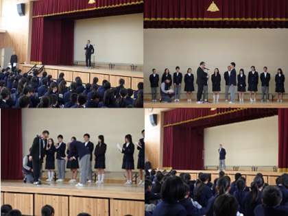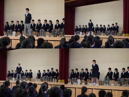 「生徒会長として,みんなの先頭に立ってしきったり引っ張ったりしているが,好きだからやっているのではありません。好きか嫌いかと聞かれれば好きかもしれないけれど,それが自分の『役割』だからやっています。1年生も,今何をすべきか,ということを考えて,次の全校集会では,『役割』を果たして下さい。全員,一人ひとつは『役割』があると思います。話をきいてあげたり,支えてあげたり,人を笑わせる,というような『役割』でもいいと思います。自分にしかできない『役割』を1つでもいいので見つけて,その『役割』を大切にしてほしいと思います。みなさんの『役割』は何ですか?考えてみて下さい。」