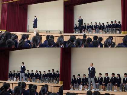 「学級委員の認証は,自分たちの代表を認証するんだという気持ちを持ってほしいです。認証式のあと,春体激励会があります。『勝ちに不思議な勝ちなし,負けに不思議な負けなし』,という話を去年しました。勝つ試合と負ける試合があって,負ける試合からいろいろと学べるかもしれないけれど,勝てば自信になる。勝ちを目指してこれまで厳しいトレーニングを積んできたりしたのだから,少しでもたくさん勝って自分に自信をつけて,夏の大会に繋げて下さい。春体は,『開会式』から始まっています。昨年の嵯峨中学校の行進は京都で一番の行進でした。今年も,行進で他の学校を圧倒して,試合にも勝つ!というつもりでビシッとやりましょう。」