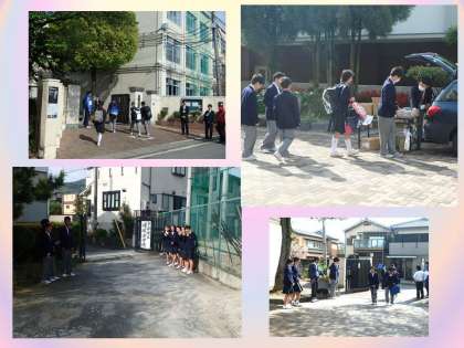 正門,西門では,挨拶運動が展開されています。「おはようございます!」と,登校してくる生徒に元気に声を掛けています。正門入ったところでは,業者による英語の辞書等の販売が行われていました。購入した人はしっかり活用して下さいね。