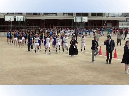 今日の練習では,トラックを歩いたあと,直線になって入ってくるところの練習もしました。スムーズに入ってくるにはコツがいるのですが,みんなそれがつかめたでしょうか。トラックの反対側まで行進したあたりは,太ももがあがらなくなってきていました。最後の最後まで,気合いを抜かずに頑張ってほしいものだと思います。