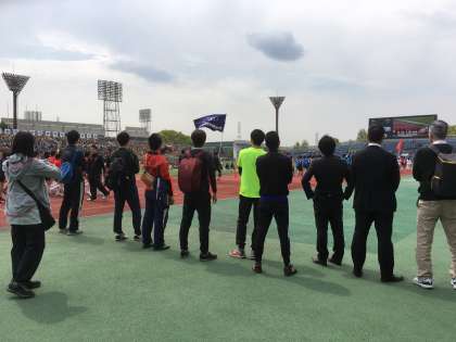↑これは,入場行進をし始めた嵯峨中選手団を見守る教員の後ろ姿です。昨日の行進練習は,家庭訪問に行く前に1分でも,との思いで本当にたくさんの教員がグラウンドに出て応援しました。そして今日のこの姿。120%の嵯峨中魂で頑張る生徒達を誇りに思い,見守っています!!