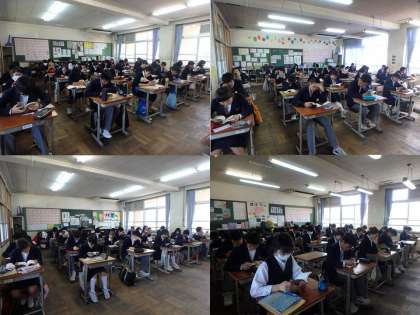3年生朝読書の様子です。8時25分にチャイムが鳴って朝読書スタートですが,チャイムが鳴る前から席について,静かな雰囲気ができあがっています。遅刻者もなく,落ち着いて一日がスタートしています。