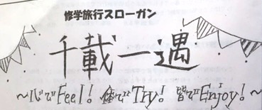 この学年,このクラスでの色々な人との出会いは2度とない。そんな私たちの修学旅行,楽しむのはもちろん!!平和学習などの学習は,しっかり心で感じ取り,壱岐・長崎での体験では分からないことでも一度チャレンジしてみる!そして楽しむところは「とことん楽しむ」というスローガンをかかげて,3日間の修学旅行がよりよいものとなるように頑張ろう!!