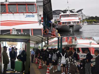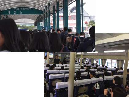ジェットフォイル乗船の様子です。1,2,3組は2階に,4,5,6,7,10組は1階に乗り込みます。
