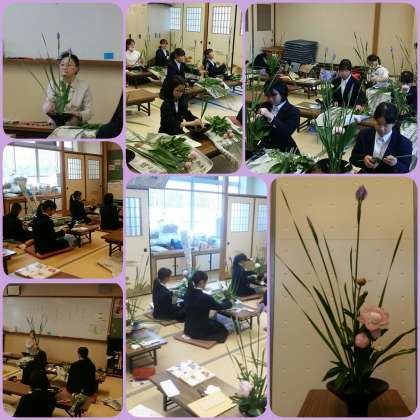 まず池坊いけばなについてDVDを見て学びました。そして先生から,鋏の使い方や切り方,剣山についてなど教えていただきました。