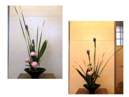 そしていよいよお花を生けます。今日のテーマは「5月のさわやかさ」。花材はショウブ,シャクヤク,ヒメガマ,ハランです。先生がお手本を見せて下さり,そのあと一人ひとり生けてみました。自由花なので,思い思いに生けました。できたら先生に見て頂いて,手直しをしていだだいて写真を撮り,いけばなスケッチノートに記入して終わりました。