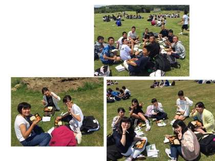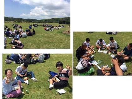 昼食の様子の写真です。芝生の上で食べるなんて,一体いつぶりなんでしょうか。みんんなで,外で,気持ちの良いお天気の中食べる昼食は格別な味だったと思います。