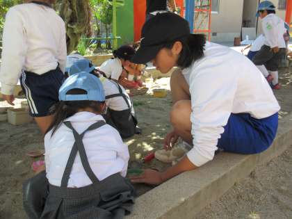幼稚園では、子どもたちと遊んだり、掃除をしたりしています。
