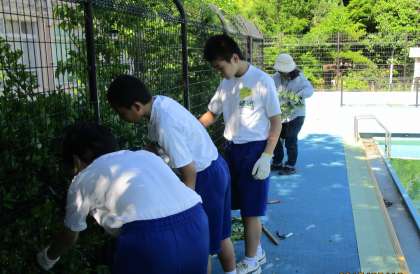 たくさん伸びている木や草を切り,プール開きに向け準備を手伝いました。