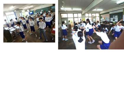 テストが終わり,4限学活のときに,応援練習をやりました。応援リーダーや上級生が前に立ち,見本を見せます。大きな声を出したり,動きをつけたり,覚えることがたくさんですが,色毎に団結してしっかりやっていいましょう。