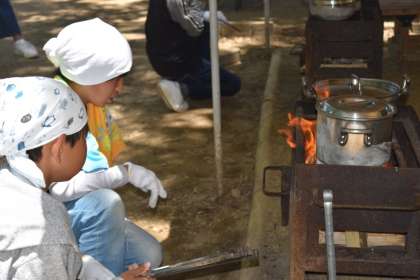 城陽市にある青少年野外活動総合センター「友愛の丘」にて、飯ごう炊さんによるカレー作りに挑戦しました。お米をといだり、具材を切ったり、各班で協力して美味しいカレーができたのではないでしょうか。