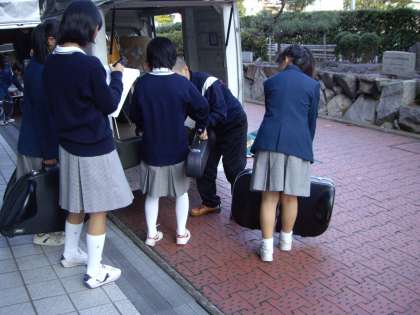 写真は その時の楽器搬出と出発時の様子です