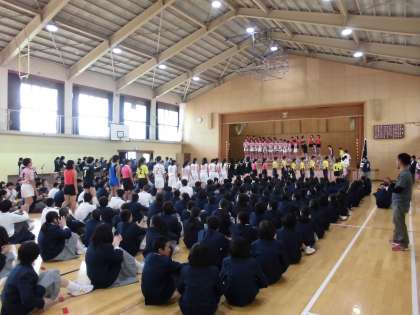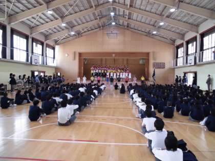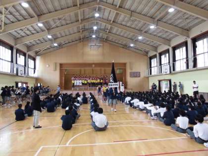 4月27日(金) 6限,体育館で春季総合体育大会の激励会を行いました。吹奏楽部の演奏のもと,各部の代表選手が入場し,壇上へ上がりました。キャプテンによる各部の決意に始まり,校長先生からの激励の言葉,生徒会本部役員からの激励の言葉,生徒会旗授与,選手宣誓,吹奏楽部の「若い力」の演奏と続きました。