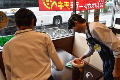 写真は,1枚目:カレー屋さん店内の机を拭き掃除中でした
