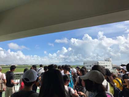 琉球村を出発したバスは「道の駅かでな」に到着しました。ここは展望場からすぐ隣にあるアメリカ空軍の嘉手納飛行場を眺めることのできる場所です。ふと目を横にやると…そこは住宅街。現地の人たちの生活圏のこんな近くに基地があることを実感しました。