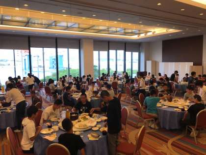 今回の修学旅行は連泊です。昨晩もお世話になったホテルに今晩もお世話になります。まだ明るい港の景色を見ながらの夕食となりました。「いきただきます」,「ごちそうさま」どちらもかけ声が盛り上がっています。