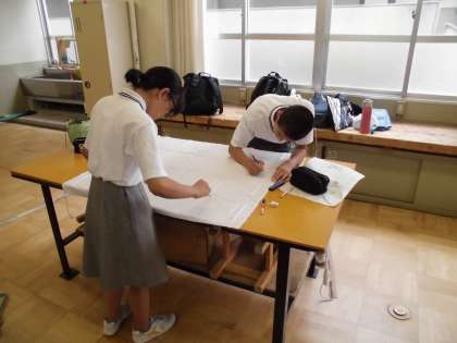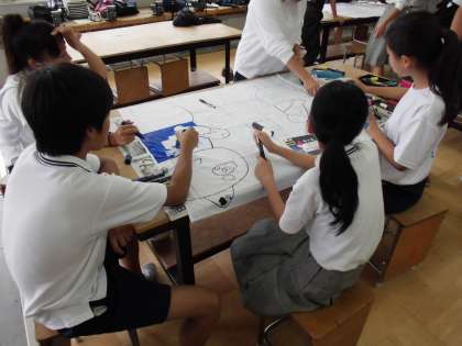 6月11日(月) 放課後,1,3年生で学級旗の制作が行なわれました。各クラスの評議員を中心にクラスで選ばれた制作者の人たちが作業に取り組みました。クラスで決めたデザインの原画を大きい布に下書きしてから色を塗っていきます。みんながんばって作業をしていました。