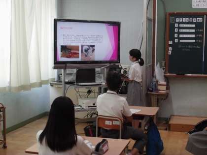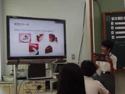 7月19日(木) 1組は,1限国語の時間に「自分の好きなもの紹介」を行いました。パワーポイントを使ってみんなの前で発表しました。好きな食べ物やお気に入りのアイドル,はまっている趣味などそれぞれの好きなものが聞けて楽しかったです。