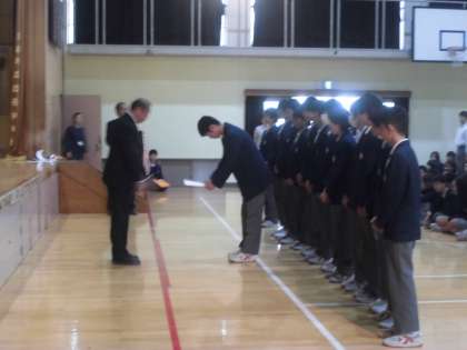 表彰の様子です。秋季大会優勝のハンドボール部男子,第3位のハンドボール部女子,陸上部の入賞者が表彰されました。