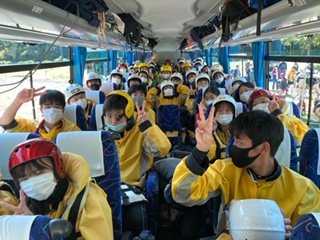 ラフティングスタイルに着替えて,ラフティング会場にバスで向かっています。