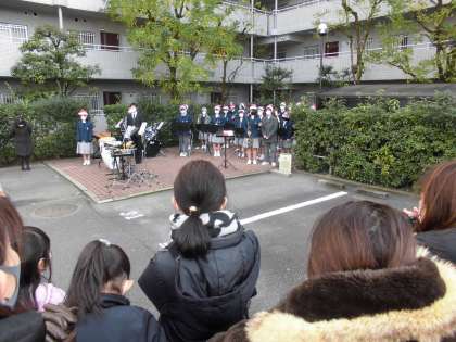 昨年来のコロナ禍により,演奏を披露する場が限られた吹奏楽部にとって今回の演奏は,大変励みになりました。地域でたくさんの方の前で演奏することは,貴重な経験となり,温かい拍手はこれからの活力になります。演奏の場をいただき,地域の皆さまとふれあい,演奏を聴いていただいたことに感謝いたします。寒い中,保護者の方にも来ていただき,ありがとうございました。