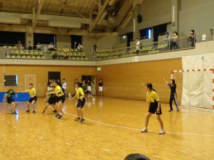5月13日(土)にハンドボールの春季大会最終日の試合が伏見港公園体育館で行われました。決勝に進んだ女子は桂川中学校と対戦しました。試合開始から一歩も譲らぬ取っては取られる展開で前半は14対14でした。後半も互角の戦いが続き、24対24の同点で延長に突入しました。お互い死力を尽くした延長戦は、前半に1点先取し、最後は27対26で逃げ切り、優勝を決めました。1時間を超える白熱した試合を戦い抜いた両チームに大きな拍手が送られました。秋からの連覇、おめでとう!