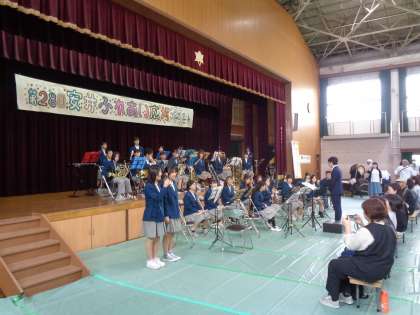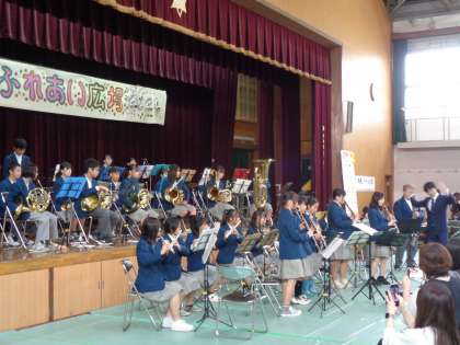 体育館でのステージ発表では、地域の保育園や児童館、各団体の方の発表が行われ、午前最後には本校吹奏楽部が出演しました。たくさんの地域、保護者の方の前での演奏で緊張もありましたが、アンコールを含め4曲披露しました。会場の皆さんからは、たくさんの声援と拍手をいただき、中学生から元気をもらったと大変喜んでおられました。子どもたちにとっても地域の方との交流は、大変貴重なものです。吹奏楽部の生徒たちにとって励みとなる、このような場を与えていただいたことに感謝いたします。吹奏楽部の皆さん、ご苦労様でした。