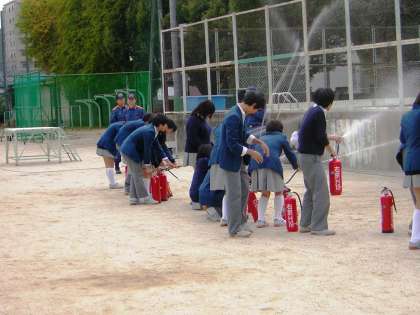 避難訓練の後、3年は消火訓練、1年は煙中体験を行いました。