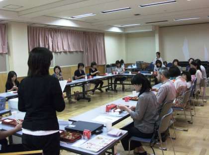 本日(26日)、12:00〜PTAの文化委員会が主催の給食試食会を行いました。体育健康教育室より、栄養士の増田真弓指導主事に講演をしていただきました。皆さん真剣にお話を聞かれていました。朝食を摂ると取らないでは頭の回転の速さに違いが出るなどのお話をしていただきました。