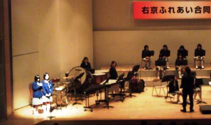 本日(9日)、京都市右京ふれあい文化会館にて、第12回右京ふれあい合同演奏会が行われました。この演奏会は、右京区内にある市立中学校の吹奏楽・合唱・和太鼓の演奏会です。前半は、各校の発表です。本校は吹奏楽部が参加し、「シンガポール・フライヤー」と「粉雪」を演奏しました。