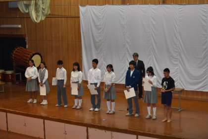 校長先生から合唱コンクールの結果発表があり,今年度は3年1・3組,2年4組,1年3組が金賞に輝きました。