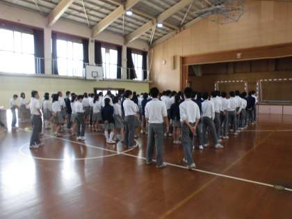 本日、「総括テスト1」が修了しました。3年生はテスト後の4限、いよいよ間近に迫った修学旅行の集団行動の練習を行いました。しばらくのぞいていましたが、全体で整列して先生の話や指示を聞くのもしっかりとできています。クラスごとに集合するのもスムーズにできるし、小集団から全体に並び直すのもあっという間に行動できます。そして、学級の代表が人数点呼をするのもとてもてきぱきしていました。本番が楽しみです。