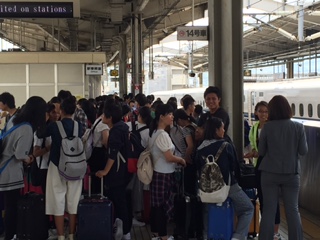 晴天の下、四条中学校3年修学旅行団は京都駅に5分前には集合を完了し、ホームで新幹線の到着を待ち構えています。いよいよ待ちに待った修学旅行のスタートです。まさしく「絆−友との旅はここから始まる−」の始まりです。