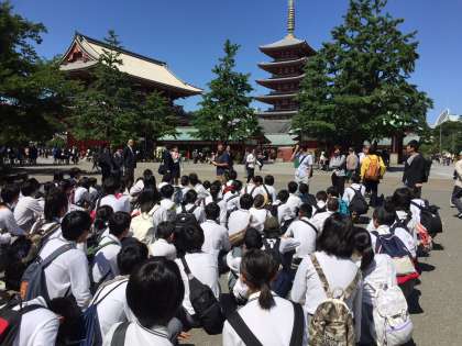 一行の午前中の足跡を振り返ってみましょう。ホテルを出発して30分ほどで浅草に到着。その後グループに分かれて浅草自主研修をしました。写真は浅草界隈で自主研修する様子です。