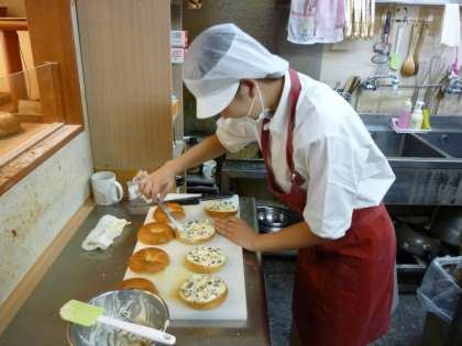 チャレンジ体験の1コマを紹介します。パン屋さんでは調理パンを作らせてもらっているようです。麺類屋さんではホールスタッフの体験をしています。小学校では体育の授業の補助をしています。生徒1人が体験しているのは1つの“しごと”ですが、学年全体では54カ所の事業所に出かけています。体験したことを仲間と交流することでイメージは広がります。仕事について職業について生徒たちはほんとうに貴重な体験をしています。