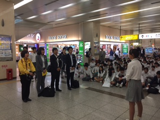 新幹線は予定通り16:17に京都駅に到着しました。新幹線から下車した一行は京都駅で写真のように解団式を行い、解散しました。生徒たちはそれぞれの交通機関を使って帰路につきました。天候にも恵まれた2泊3日の修学旅行が無事終了しました。間もなく生徒たちは思い出話をお土産にそれぞれの自宅に帰ります。保護者の皆様はゆっくり思い出話を聞いてあげてください。それでは、これにて修学旅行情報を終了させていただきます。